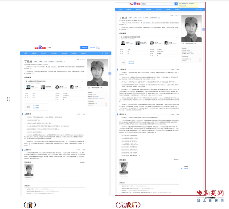 烈士丁思林百度詞條前后對比(左為之前,右為修改完善后)