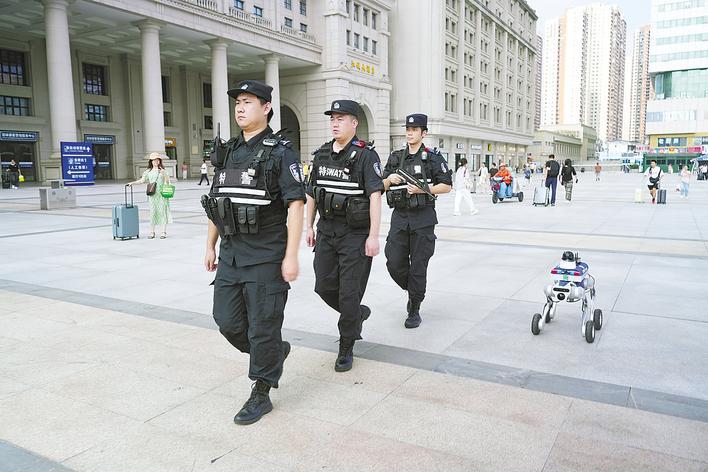 漢產“機器警犬”隨警察一起在漢口火車站巡邏。 (受訪單位供圖)