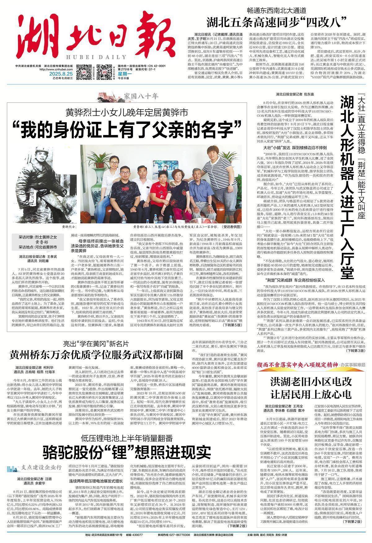 “在爺爺的故居收看抗戰勝利80周年閱兵直播,特別有意義。爺爺沒有看到的盛世,我們替他見證。”黃俊友告訴湖北日報全媒記者,湖北日報《家國八十年丨黃驊烈士小女兒一家定居黃驊市“我的身份證上,寫著父親的名字”》的報道非常感人,真實再現了一個抗戰家庭80年的命運變遷,也讓更多人知道了爺爺的抗戰事跡。