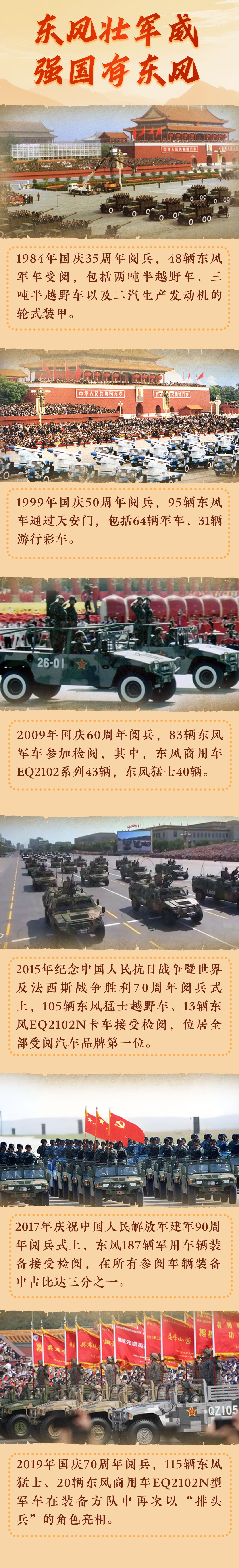 東風(fēng)因軍而建、因軍而興、因軍而榮,這支從鄂西北山溝中走出的“鋼鐵長城”,用超越半個(gè)世紀(jì)的堅(jiān)守,鑄就了中國軍車第一品牌的傳奇。回顧歷史,東風(fēng)汽車已經(jīng)6次光榮接受黨和人民檢閱,其中在2009年,走過一個(gè)甲子年的共和國迎來60華誕,40輛東風(fēng)“猛士”首次作為引導(dǎo)車出現(xiàn)在了閱兵大典中。