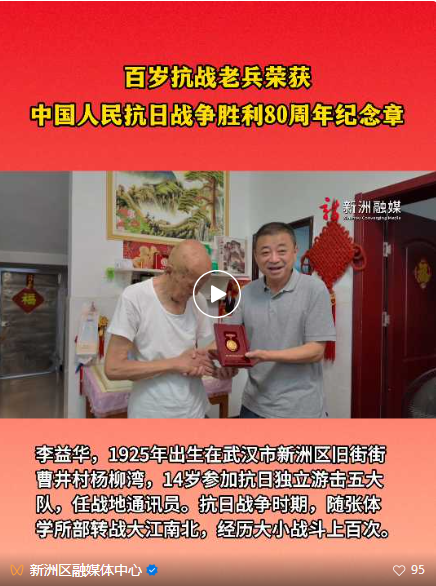1925年農歷六月初四,李益華出生在新洲區舊街街曹井村楊柳灣一個農民家庭。親歷抗日戰爭的烽火、解放戰爭的硝煙,他是歷史的鮮活見證者。所獲中國人民抗日戰爭勝利60周年、70周年、80周年紀念章,無聲訴說著老人曾經的浴血榮光。