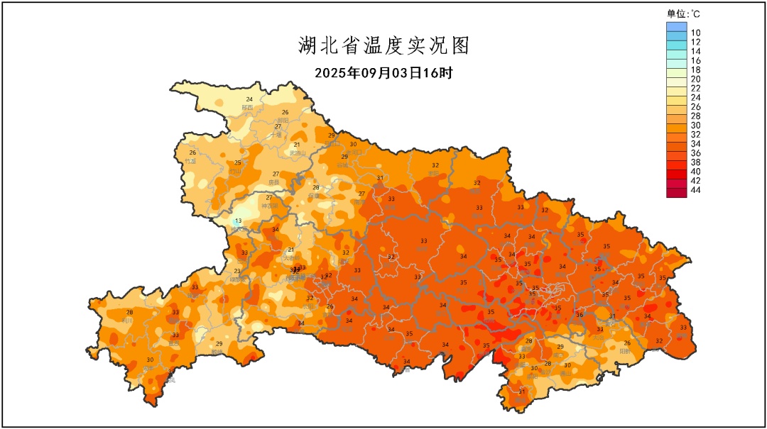 湖北日?qǐng)?bào)訊(記者汪菁華、實(shí)習(xí)生葉王鳳)9月3日的湖北,升溫與降溫并存。截至16時(shí),武漢、荊州、孝感、黃岡等地超33%的站點(diǎn)出現(xiàn)35℃的高溫天氣,范圍較2日有所擴(kuò)大。武漢繼8月30日至9月2日連續(xù)4天退出“高溫群聊”之后,再次“入群”。