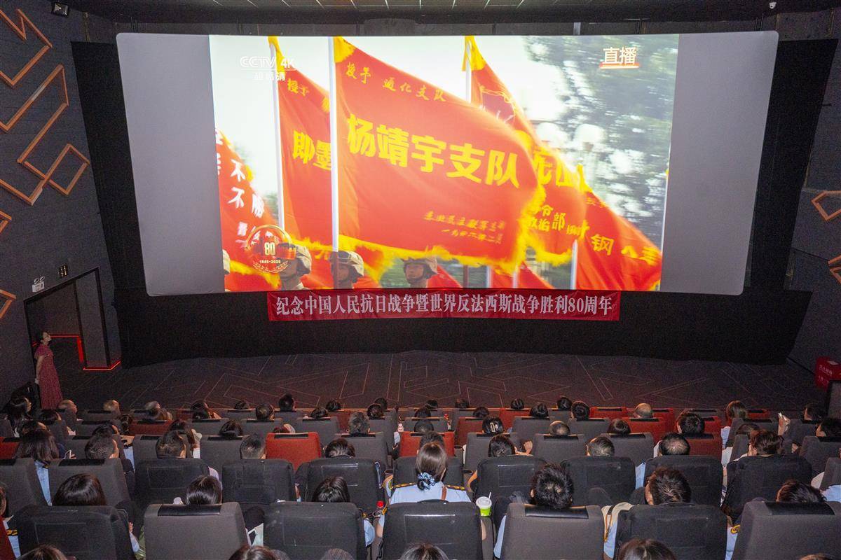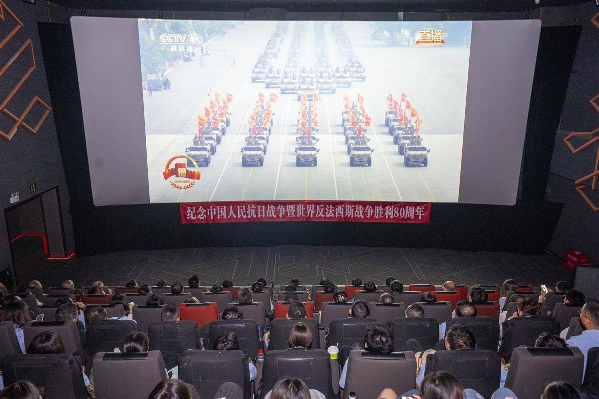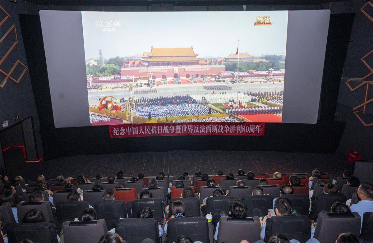 9月3日,壹方百麗宮影城,武漢市江岸區130多名社會各界群眾代表,觀看紀念中國人民抗日戰爭暨世界反法西斯戰爭勝利80周年閱兵式直播。(湖北日報全媒記者 魏錸 通訊員 鄭黎 攝)
