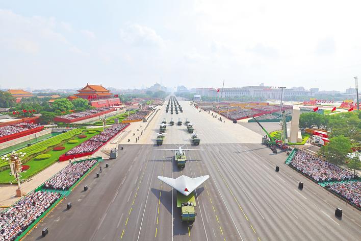 寬闊的長安街向遠(yuǎn)處延伸,以“復(fù)興”命名的道路平直如砥。受閱官兵昂首挺胸、步履鏗鏘,向著強(qiáng)國強(qiáng)軍的光明前景前進(jìn)。