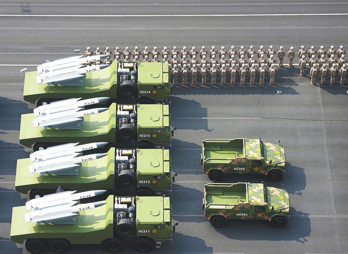 海上作戰(zhàn)群 海上作戰(zhàn)群由艦載防空武器方隊、反艦導(dǎo)彈方隊、水下兵器方隊組成。 受閱裝備包括海紅旗-9C導(dǎo)彈、紅旗-16C導(dǎo)彈、紅旗-10A導(dǎo)彈、激光武器,鷹擊-15導(dǎo)彈和鷹擊-19、鷹擊-17、鷹擊-20高超聲速導(dǎo)彈,輕型魚雷、助飛魚雷、重型魚雷、新型特種水雷。