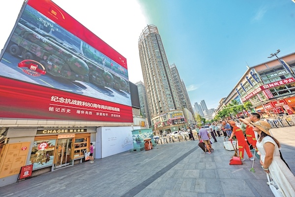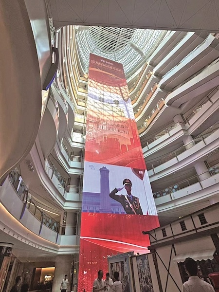 9月3日上午10時,極目新聞記者在武商夢時代看到,不少人聚集在中庭60米高的瀑布大屏前,觀看紀(jì)念大會和閱兵直播。