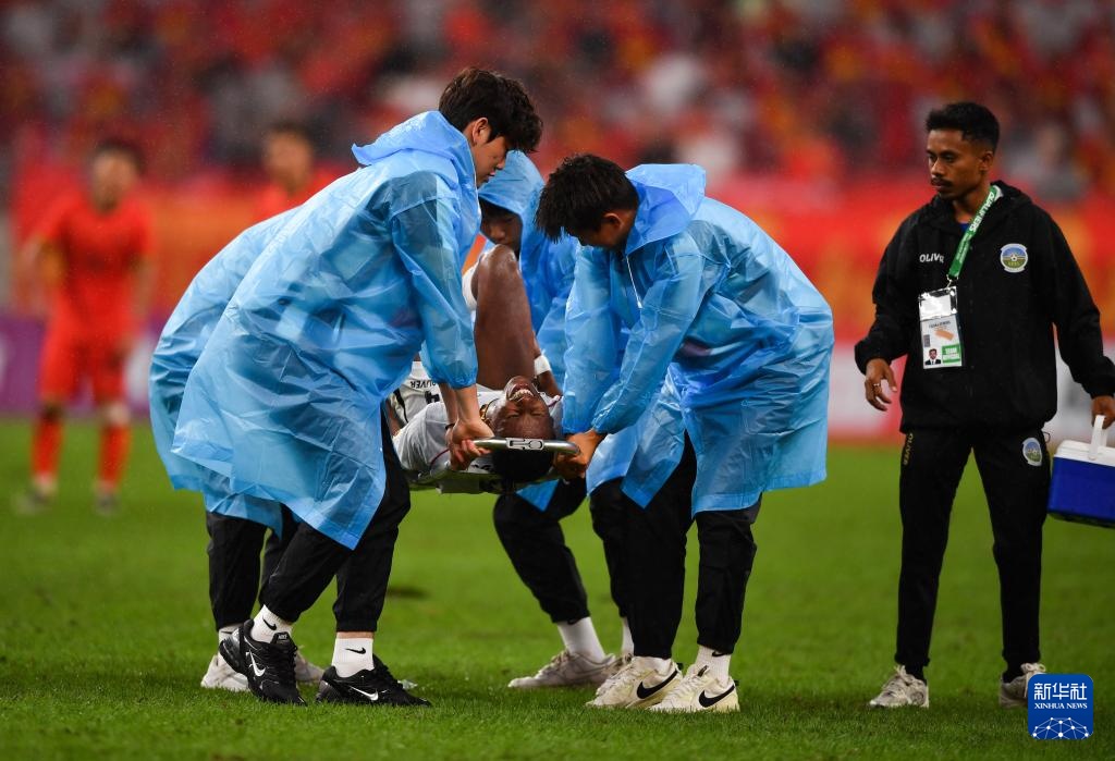 9月3日,東帝汶隊球員馬利克(中)在比賽中受傷離場。