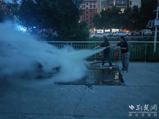 8月29日晚7時許,鄂州市東升社區附近,一輛汽車引擎蓋內突然冒起陣陣白煙,并伴有火光,正在加班的劉銳發現后,迅速呼喚同事黃子悅、張海芬攜帶4具滅火器前往處置,并同步撥打119報警電話。