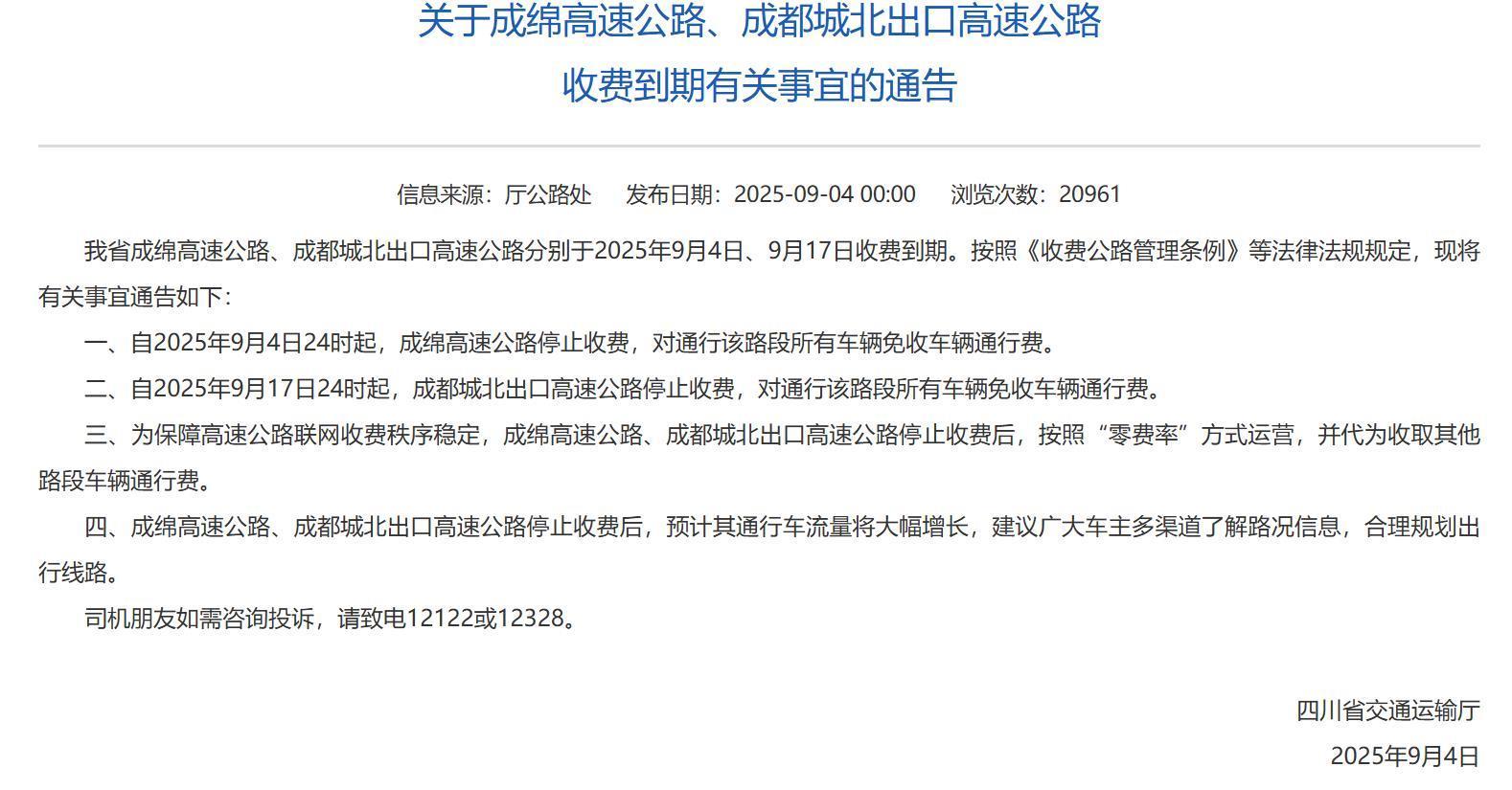9月4日,四川省交通運輸廳發布《關于成綿高速公路、成都城北出口高速公路收費到期有關事宜的通告》(下稱《通告》)。