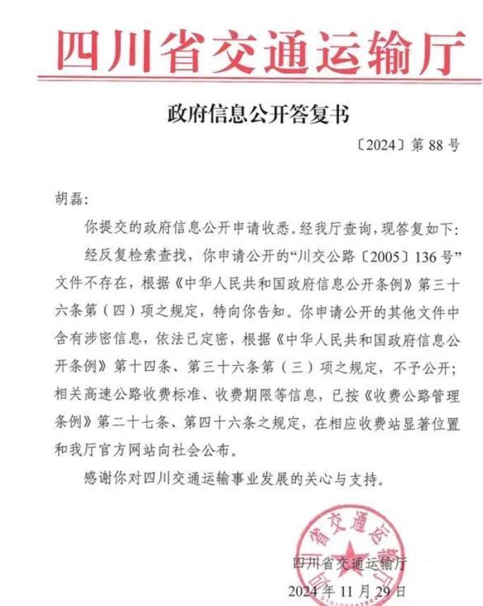2024年11月29日,四川省交通運輸廳《政府信息公開答復書》顯示,胡磊申請的相關信息,文件中含有涉密信息,依法已定密,根據規定不予公開。胡磊不服,申請行政復議。2025年3月6日,四川省政府出具《行政復議決定書》,稱在疫情防控期間車輛通行,交通運輸部等國家部委于2020年開始向各地下發相關通知,要求各地根據實際情況依法保障收費公路車輛通行。依據上級通知,經四川省政府同意,四川省交通運輸廳于2024年3月制發了重新確定成錦、城北出口高速公路收費截止日期的通知。經本機關審查,上述相關文件均嚴格按照我國《保守國家秘密法》關于定密要求,確定密級為“秘密”,保密期限為“長期”。