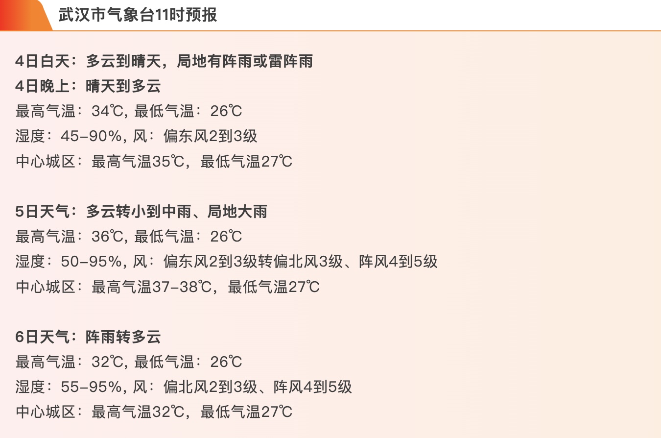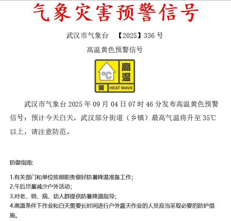 湖北日報訊(記者湯煒瑋、實習生任康中、通訊員陳聲超)9月4日7時46分,武漢市氣象臺發布高溫黃色預警信號:預計今天白天,武漢部分街道(鄉鎮)最高氣溫將升至35℃以上,請注意防范。預計今明兩天,武漢市高溫依舊堅挺,防暑降溫的工作仍不可松懈。不過好消息是,隨著明天新一輪降水的到來,周末武漢市將暫時退出高溫圈,體感上也會涼爽不少。