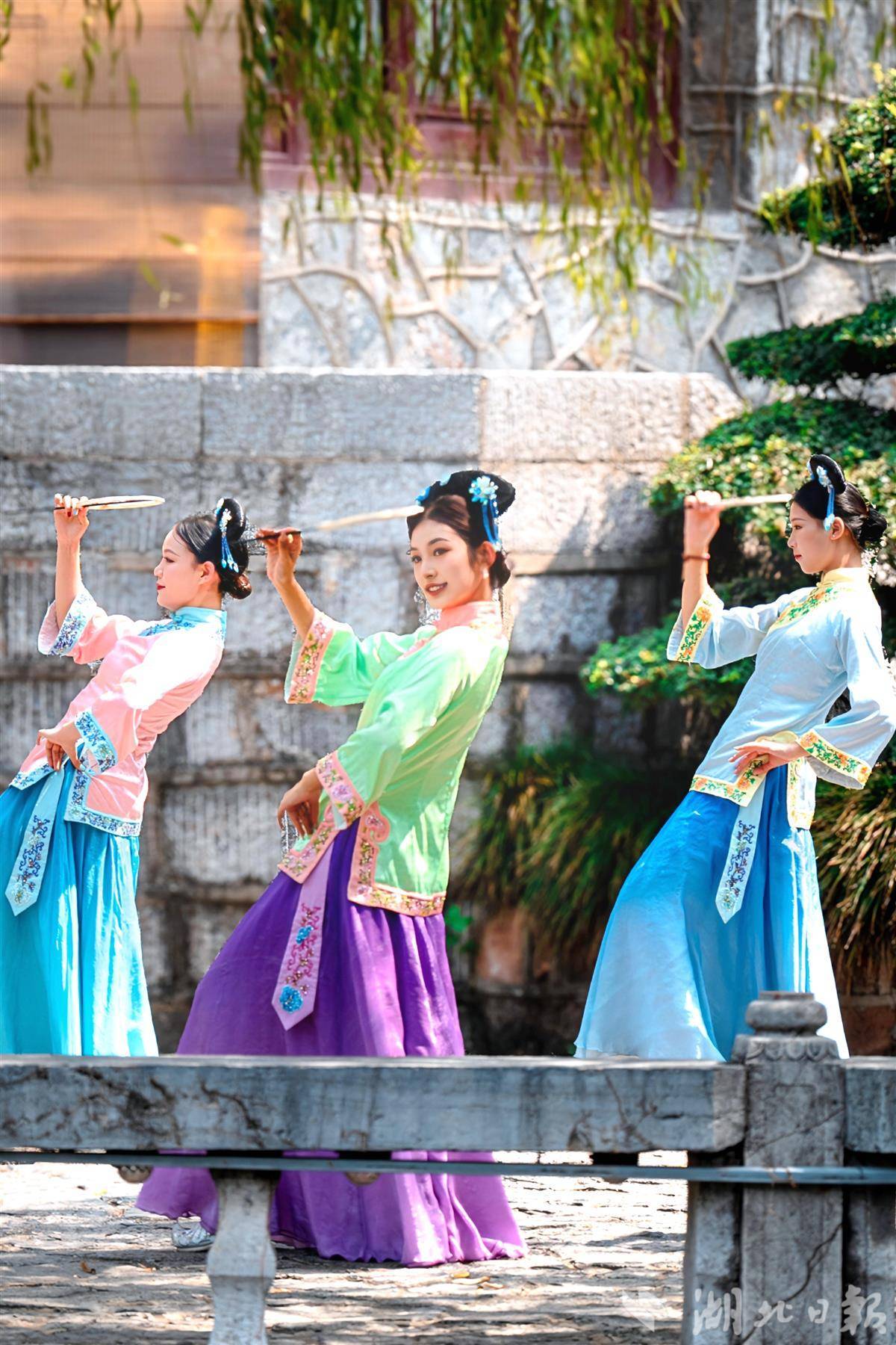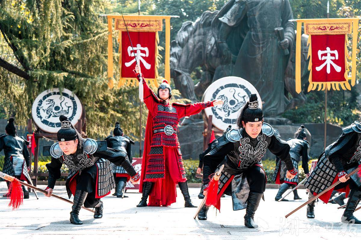 在主樓前西區廣場,《鳳舞九天》大型樂舞每天四場,舞者衣袂飄飄如鳳凰振翅,紅綢翻飛間,與黃鶴樓飛檐斗拱相映成趣;以鵝池為天然畫幕,《清風弄墨》的舞者化身“水墨精靈”,現場水墨意境氤氳,仿佛一幅流動的古畫在池畔徐徐鋪展;激昂鼓點中,岳飛廣場的《精忠報國》氣勢如虹,舞者身姿剛勁如岳家軍將士,揮臂、踢腿間力量感十足,家國情懷悄然升騰;擱筆亭里,《唐樂》與《夢回太白》的樂聲、詩聲交織,古與今的對話在此自然發生……