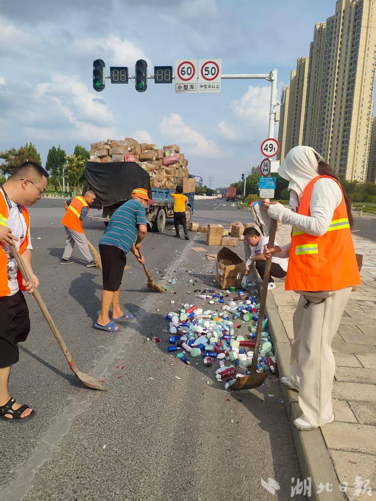 湖北日報訊(記者張競恒、通訊員汪玉平、朱小玲)9月3日下午4時,武漢市東西湖區東吳大道與高橋五路交叉口紅綠燈處,一輛貨車在轉彎時因操作過急,車上十余箱化妝品不慎跌落。頃刻間,各類瓶瓶罐罐散落路面,部分玻璃瓶摔碎形成大量碎片,不僅影響交通,更帶來安全隱患。正當貨車司機一籌莫展時,長青街環衛公司巡查人員及時伸出援手,迅速組織力量協助清理,僅用20分鐘便恢復道路整潔與通行。