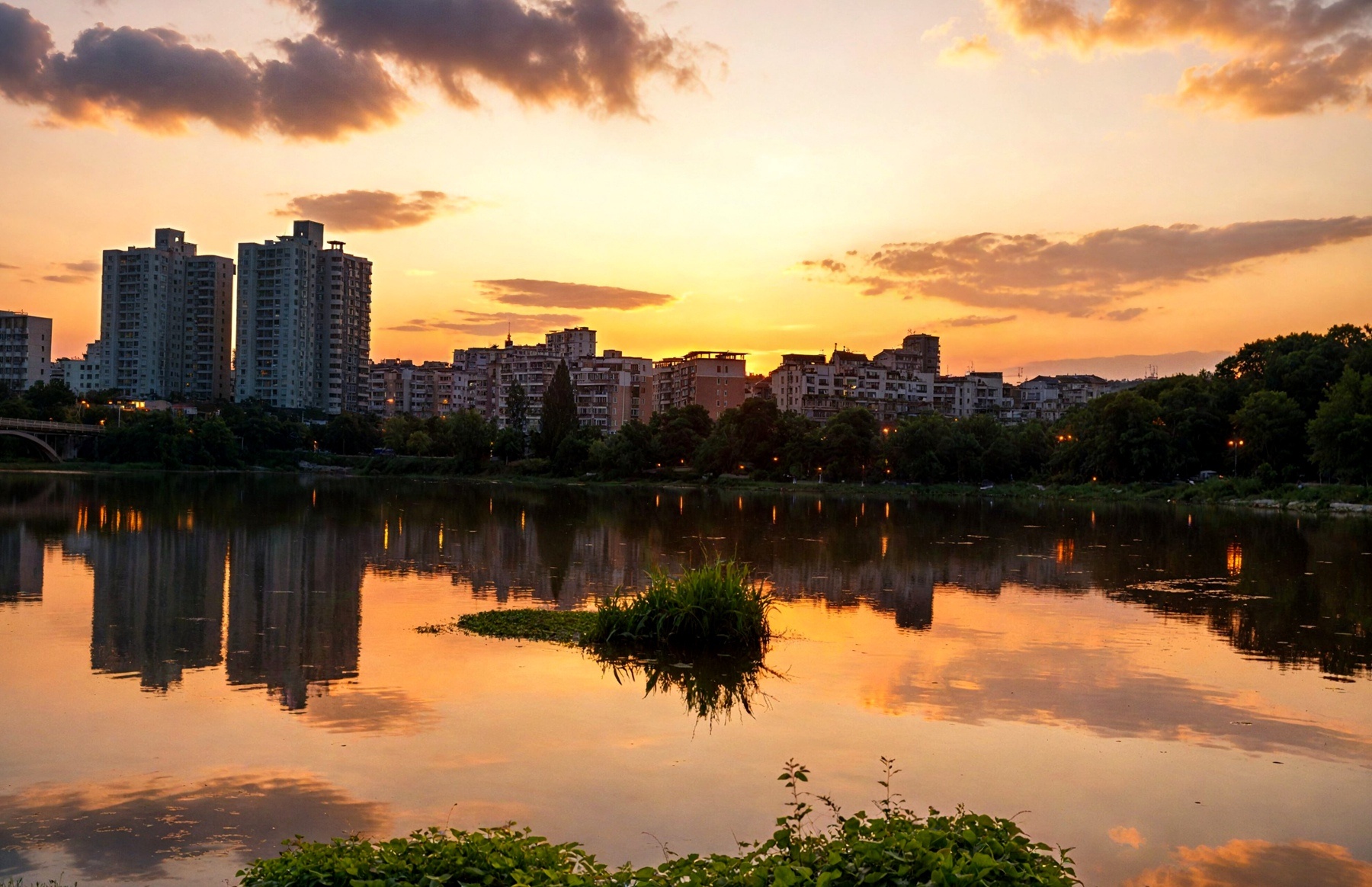 晚霞倒映在水中,與岸邊的建筑、綠樹融為一體,形成了水天一色的壯美景觀。