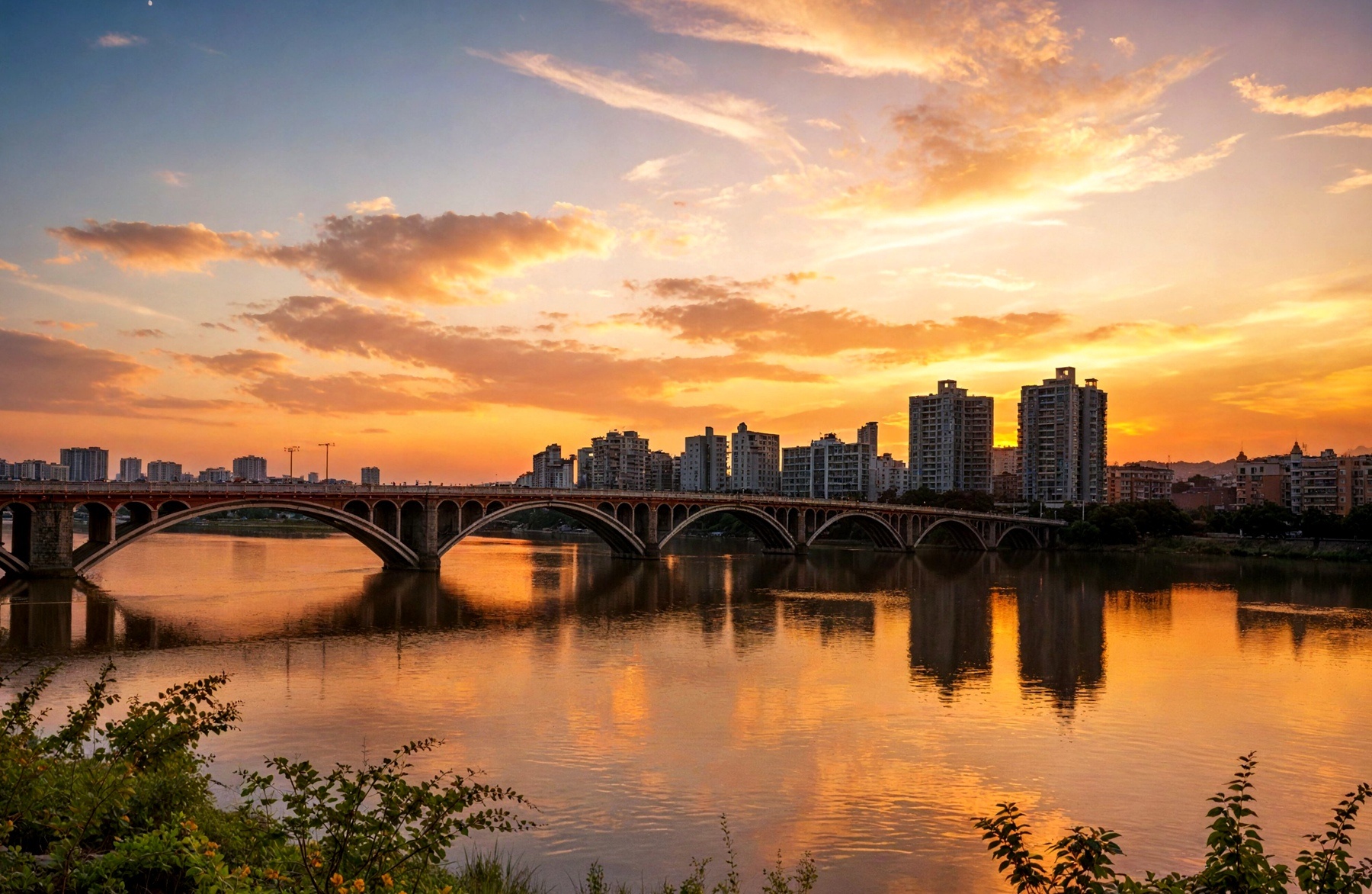 到了傍晚,驚喜仍在繼續。絢麗的晚霞如期而至,將黃柏河小溪塔的水面和岸上的建筑物都染成了金紅色。