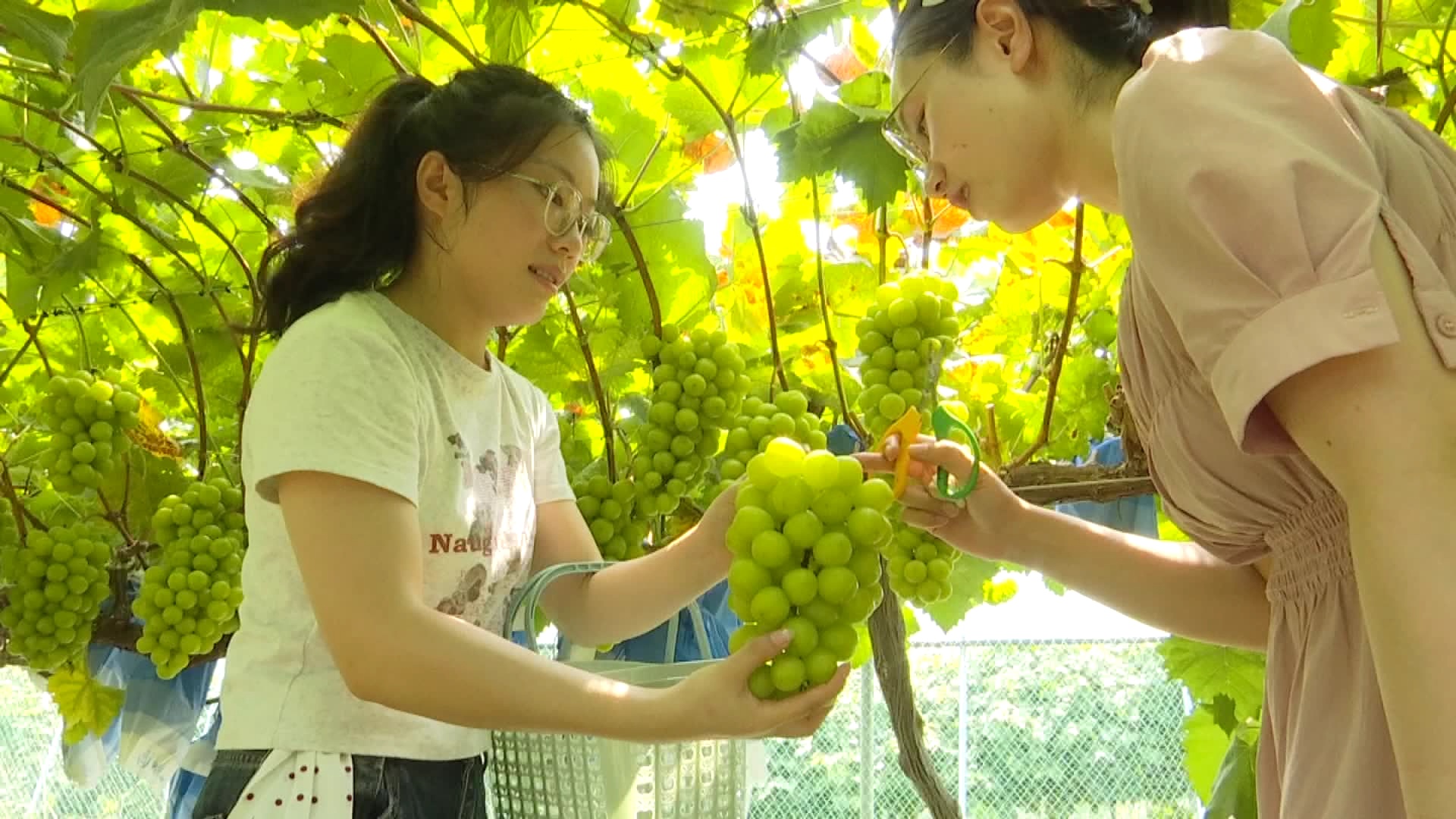 與此同時,位于黃泥村的金青牛生態園內,沉甸甸的葡萄綴滿藤蔓,飽滿的果粒在陽光下泛著瑪瑙般的光澤。游客們提著籃子,穿梭于葡萄架下,精心挑選心儀的果實。“今天專程約朋友來采摘,葡萄個大味甜,要多帶些回家給朋友們嘗嘗。”市民汪女士輕輕托起一串晶瑩的葡萄,欣喜地向記者展示。