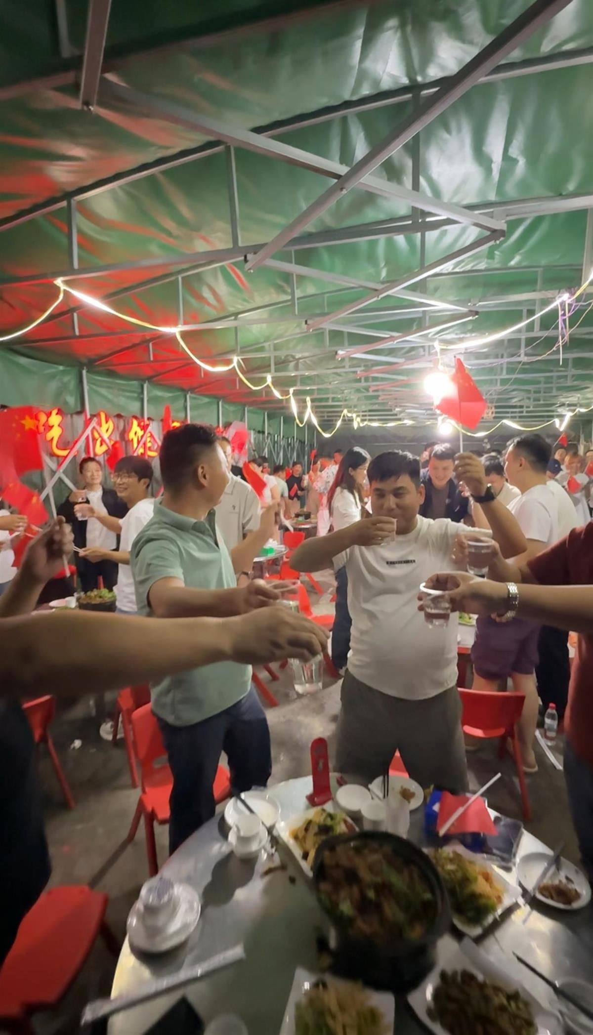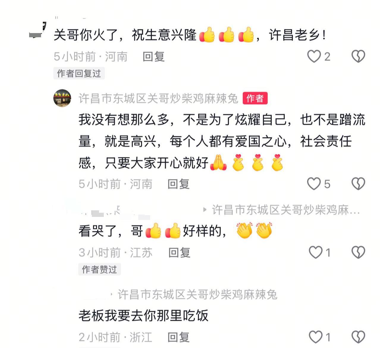 9月3日晚,當地媒體報道了此事。視頻中,店里的顧客齊聲唱響《歌唱祖國》,共同舉杯祝福祖國繁榮昌盛。極目新聞記者注意到,9月4日20時,關先生炒雞店的社媒賬號未發布相關視頻,但不少網友在其賬號的其他視頻中為他點贊。有網友提問:“你是不是全場免單的老板,我要去你那里吃飯。”還有網友曬出地圖導航截圖表示:“不算遠,有時間一定去捧場。”關先生則表示:“不是為了炫耀自己,也不是為了蹭流量,就是高興。”