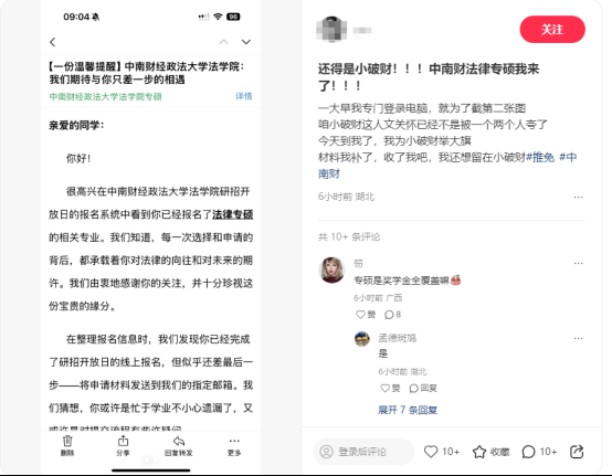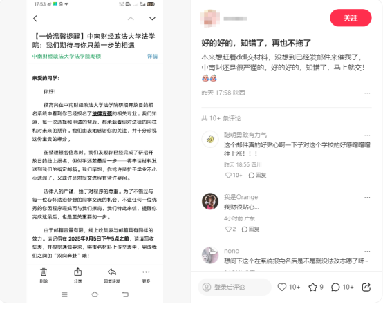 荊楚網(wǎng)(湖北日報(bào)網(wǎng))訊(記者 周夢伊)“法律人的嚴(yán)謹(jǐn),始于對(duì)程序的尊重。為了不錯(cuò)過與每一位心懷法治夢想的同學(xué)交流的機(jī)會(huì),不讓優(yōu)秀的你因程序瑕疵與我們擦肩,我們特此來信,提醒你完成這最后,也是至關(guān)重要的一步……”9月3日,一封來自中南財(cái)經(jīng)政法大學(xué)法學(xué)院的溫馨提醒郵件在社交媒體引發(fā)熱議。