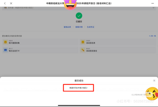 許多收到提醒郵件的同學(xué)將其分享至小紅書等平臺(tái),大家紛紛點(diǎn)贊跟評(píng)。在提交電子材料收集表的截止頁,馬老師還加上了暖心文字——“希望9月在中南大相見!”