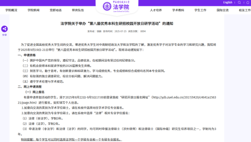 7月25日,中南財(cái)經(jīng)政法大學(xué)法學(xué)院發(fā)布關(guān)于舉辦“第八屆優(yōu)秀本科生研招校園開放日研學(xué)活動(dòng)”的通知。通知中提到,有意申請參加活動(dòng)的學(xué)生須于9月5日17:00前登錄網(wǎng)址進(jìn)行報(bào)名并提交相關(guān)電子材料,逾期不再接收材料。