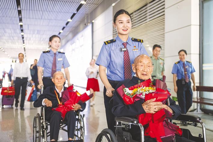 16時許,G69次列車準時抵達武漢站,在家屬和隨行工作人員攙扶下,兩位100歲的抗戰老兵胸掛中國人民抗日戰爭勝利80周年紀念章,拄著拐杖,在人們的攙扶下走下車廂,坐上輪椅。迎接人員快步上前,向他們及其他赴京觀禮的代表們致以崇高的敬意,并一一敬獻鮮花。