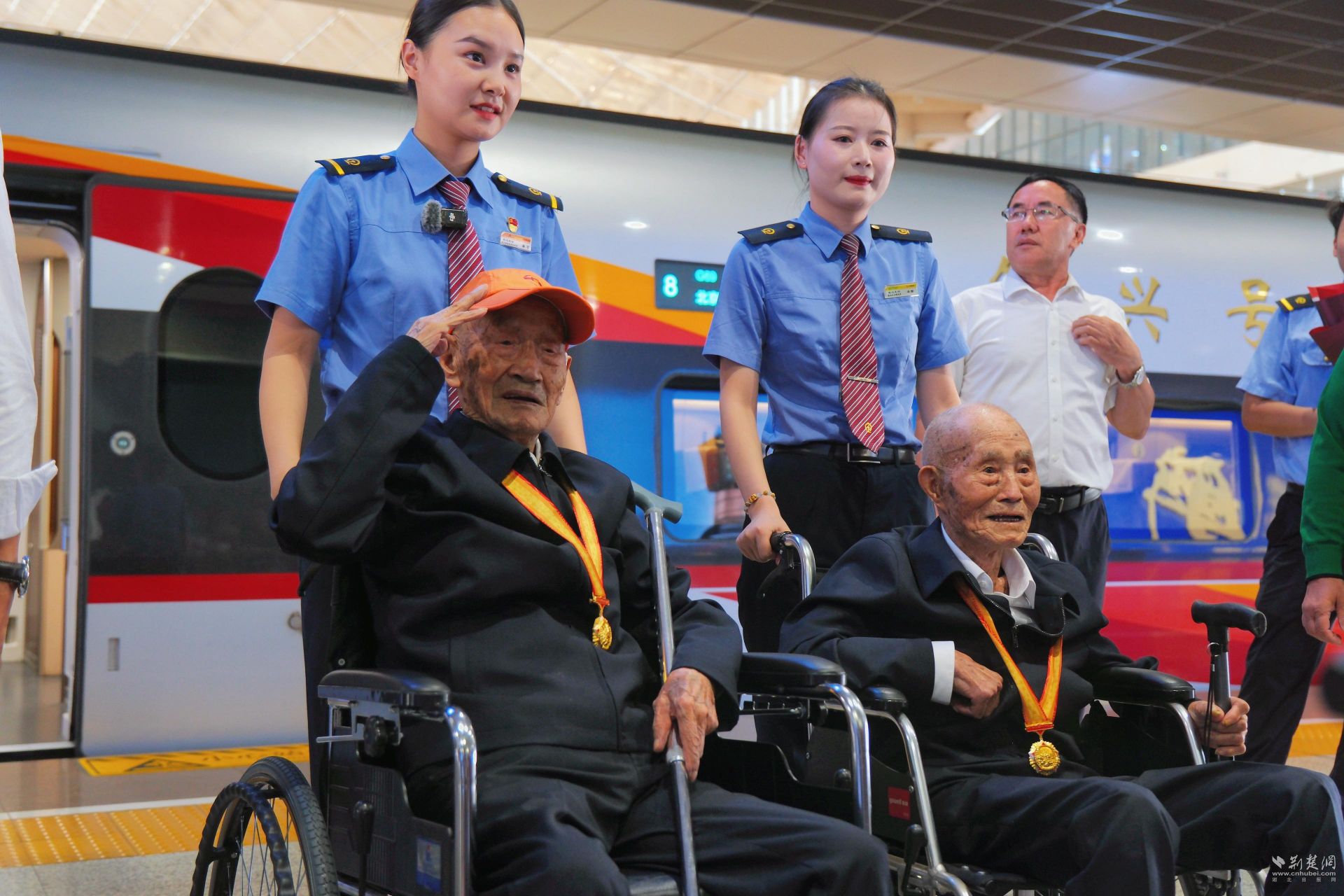 兩位百歲抗戰老英雄宋其祥、劉吉祥從列車中緩緩走出,胸前戴著閃亮的“中國人民抗日戰爭勝利80周年”紀念章。宋其祥老英雄主動向接站人員們敬禮致意。