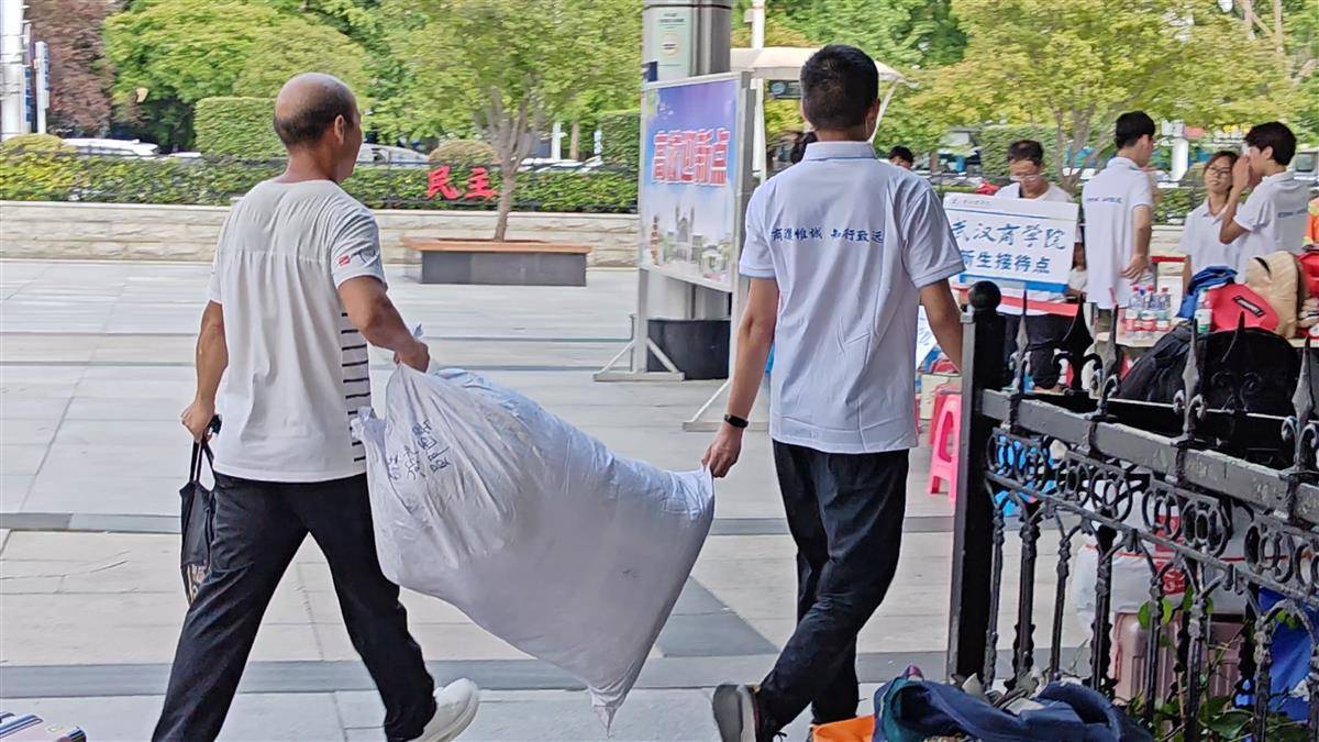 武漢商學院志愿者在武昌火車站幫學生家長抬行李。湖北日報見習記者唐雪舟攝