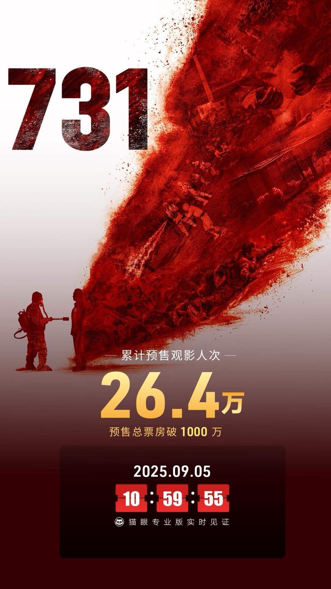 電影《731》9月4日開啟預售,截至9月5日上午11時許,該片預售總票房達到1000萬,預售觀影人次超過26萬,9月18日上映首日的預售場次則突破了10萬場。