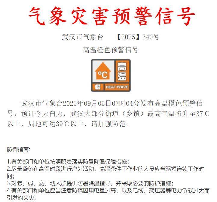湖北日?qǐng)?bào)訊(記者湯煒瑋、實(shí)習(xí)生任康中、通訊員陳聲超)9月5日7時(shí)4分,武漢市氣象臺(tái)發(fā)布高溫橙色預(yù)警信號(hào):預(yù)計(jì)今天白天,武漢大部分街道(鄉(xiāng)鎮(zhèn))最高氣溫將升至37℃以上,局地可達(dá)39℃以上,請(qǐng)加強(qiáng)防范。