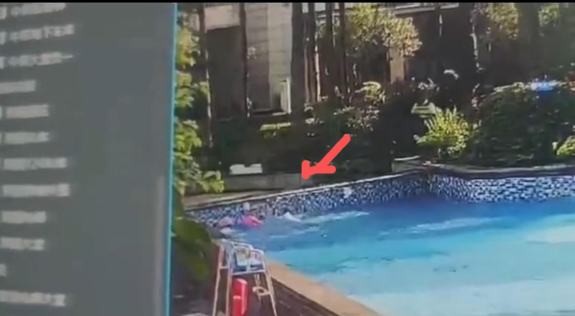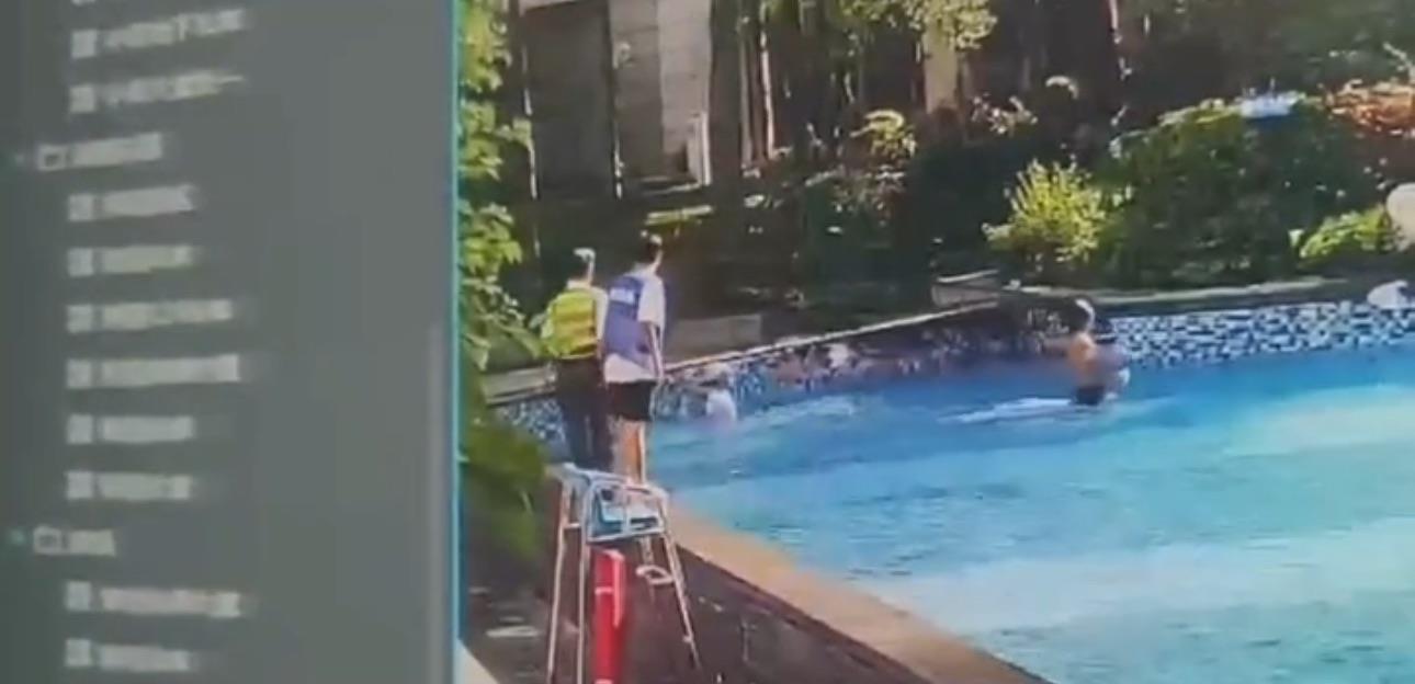 視頻顯示,三個小孩在泳池里玩耍,當(dāng)他們游到泳池一角時發(fā)生了事故,一個小孩消失在畫面中,另外兩個小孩試圖施救。后來,一位家長和小區(qū)保安、泳池安全員趕來,家長抱著一個孩子離開,另外一個孩子也跟著走了,視頻中沒見到第三個孩子的身影。
