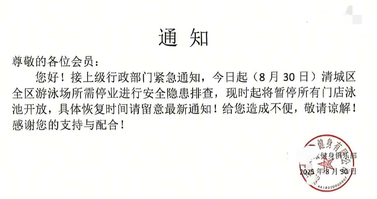 8月30日,清遠當(dāng)?shù)匾患殷w育公司曾發(fā)布通知,表示即日起清城區(qū)全區(qū)游泳場所需停業(yè)進行安全隱患排查,暫停所有門店泳池開放。9月5日,該公司一家健身房工作人員告訴極目新聞記者,泳池將于8日恢復(fù)開放,并稱此次泳池暫停開放與8月29日發(fā)生的事故無關(guān),只是在做清潔,并表示當(dāng)天已有相關(guān)部門來檢查過。