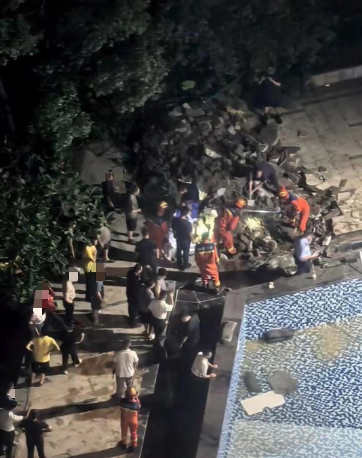 另一段夜間拍攝的視頻顯示,泳池旁邊停著一輛消防車,視頻里能聽見機械作業(yè)的聲音與女性的哭聲,泳池旁的路面被挖開。有網(wǎng)友稱“挖掘機挖到半夜才挖出來,一個七八歲的小女孩”。