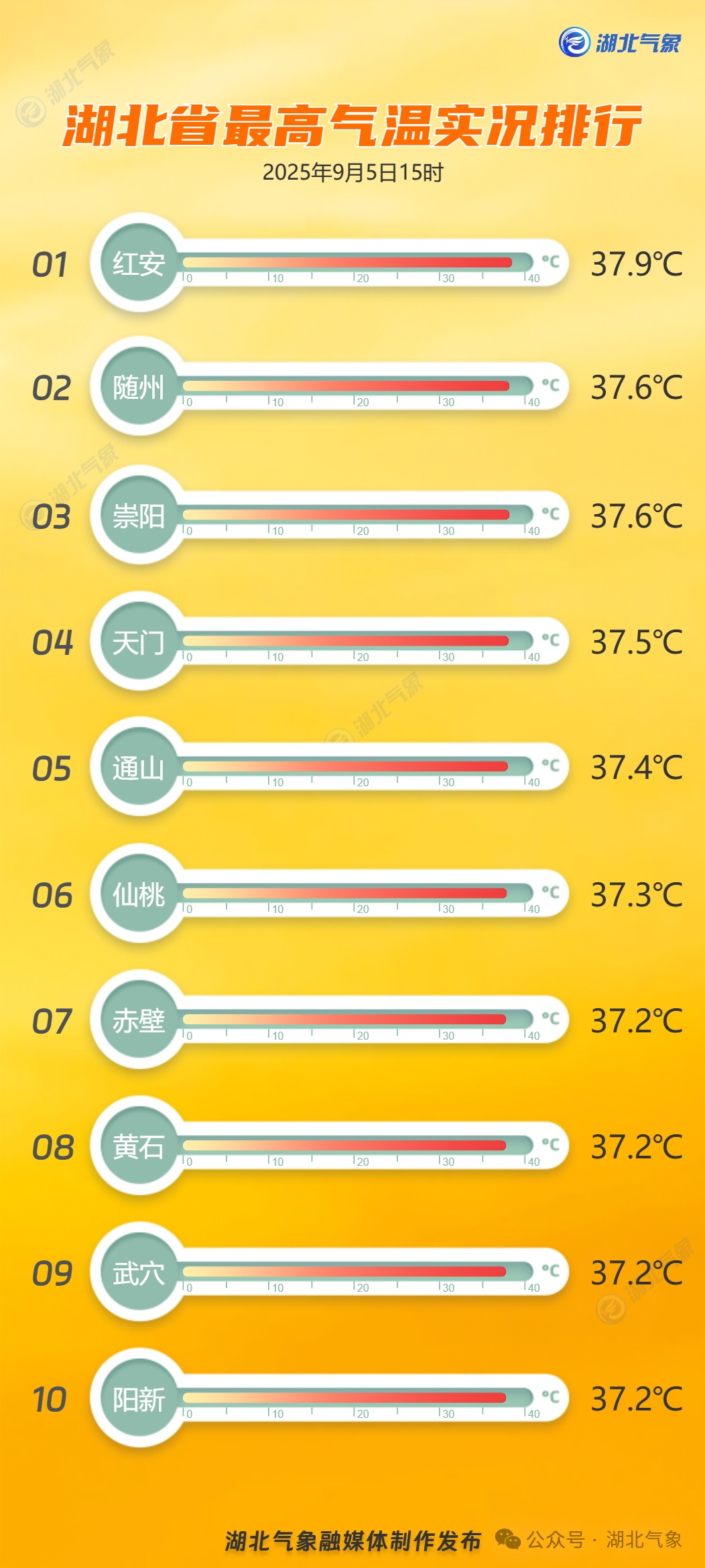 湖北日報訊(記者汪菁華、實習生葉王鳳)9月5日,雨水和高溫再度同臺,湖北省氣象臺發布強對流黃色省級預警。5日白天,荊州、黃岡、咸寧等地出現分散性陣雨或雷陣雨,最大雨量麻城市木子店鎮32毫米,2個鄉鎮出現8級雷暴大風。相比降雨,“高溫”才是天氣主角。截至下午3時,除鄂西北在27~30℃,其他地區普遍有34~37℃,全省有近6成縣市在35℃以上,主要集中在中東部和三峽河谷地區,紅安最高達37.9℃,多地氣溫升至本周頂峰。