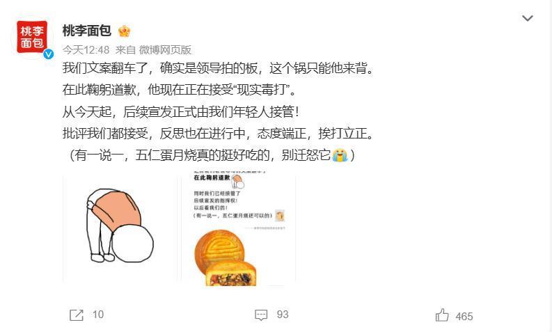 5日,桃李面包官方微博賬號就此事發文道歉稱:“我們文案翻車了,確實是領導拍的板,這個鍋只能他來背。在此鞠躬道歉,他現在正在接受‘現實毒打’。從今天起,后續宣發正式由我們年輕人接管!批評我們都接受,反思也在進行中,態度端正,挨打立正。”