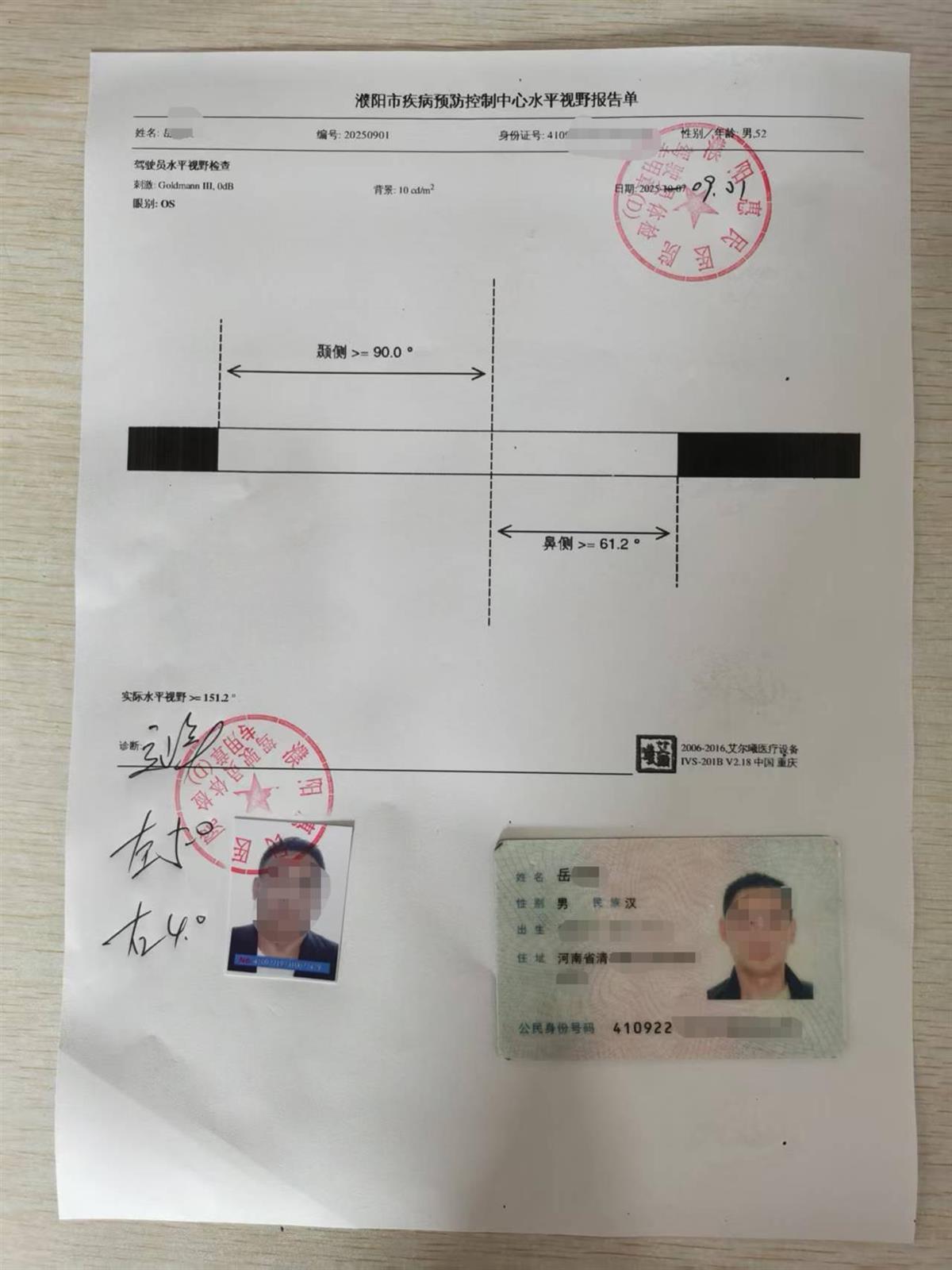 曹先生說,2021年8月,岳某在濮陽惠民醫院辦理了雙眼正常均為5.0的體檢表,提交給濮陽市車管所,拿到了長期駕照。最近他舉報后,市長熱線回復稱,岳某申請駕照審驗時雙眼視力正常,駕駛證照片雙眼無異常,右眼也沒有傷疤。岳某自述2024年眼部受傷導致右眼塌陷。今年9月1日鑒定結果為:岳某照片雙眼明顯不等大,右眼顯塌陷,且右眼顳部有外傷傷疤,與2021年8月體檢時照片明顯不一樣,后經測試左眼5.0,右眼4.0,單眼水平測試大于150度,符合C1證國家標準。