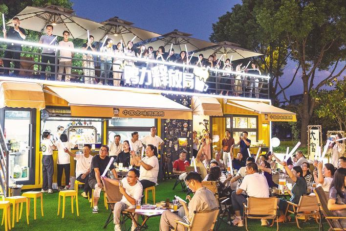 9月1日晚,武漢市東西湖區走馬嶺街食品工業區煥新升級,打造工業旅游消費新場景。在周黑鴨工廠店門前,工業風集裝箱主題市集燈火璀璨,人們圍坐品嘗鹵味、舉杯暢聊,共享沉浸式夜間社交空間。