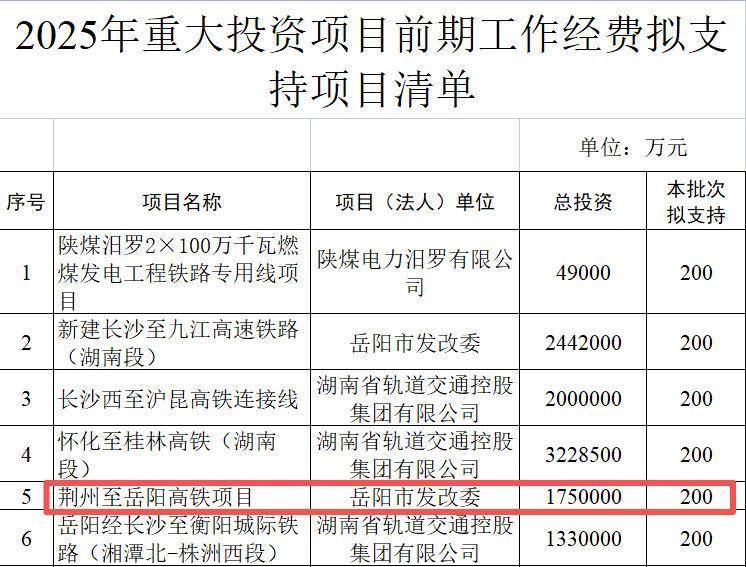 其中,荊州至岳陽高鐵項目負責單位為岳陽市發改委,總投資175億元,此次擬支持前期工作經費200萬元。
