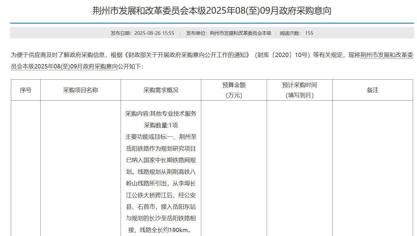 與此同時,在荊州市發改委近期發布的2025年8月至9月政府采購意向中,也將荊州至岳陽鐵路的前期研究納入采購名單。