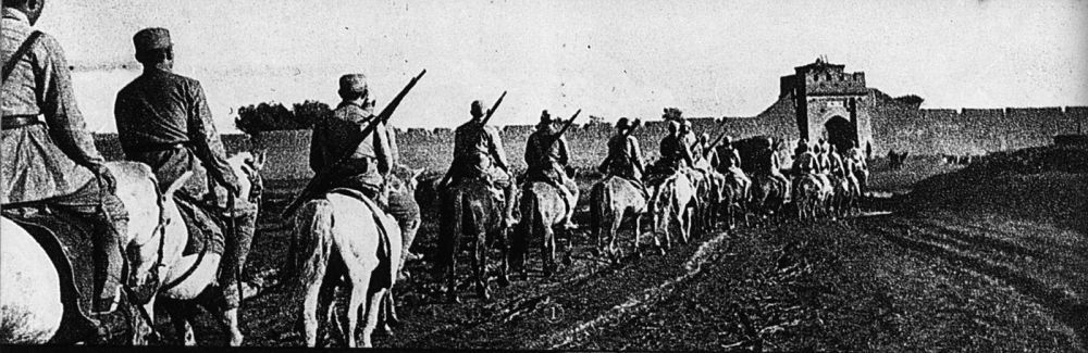 1945年8月,中國抗日武裝力量向日軍發起全面反攻。圖為八路軍晉綏部隊解放興和城,騎兵部隊列隊進城。新華社發