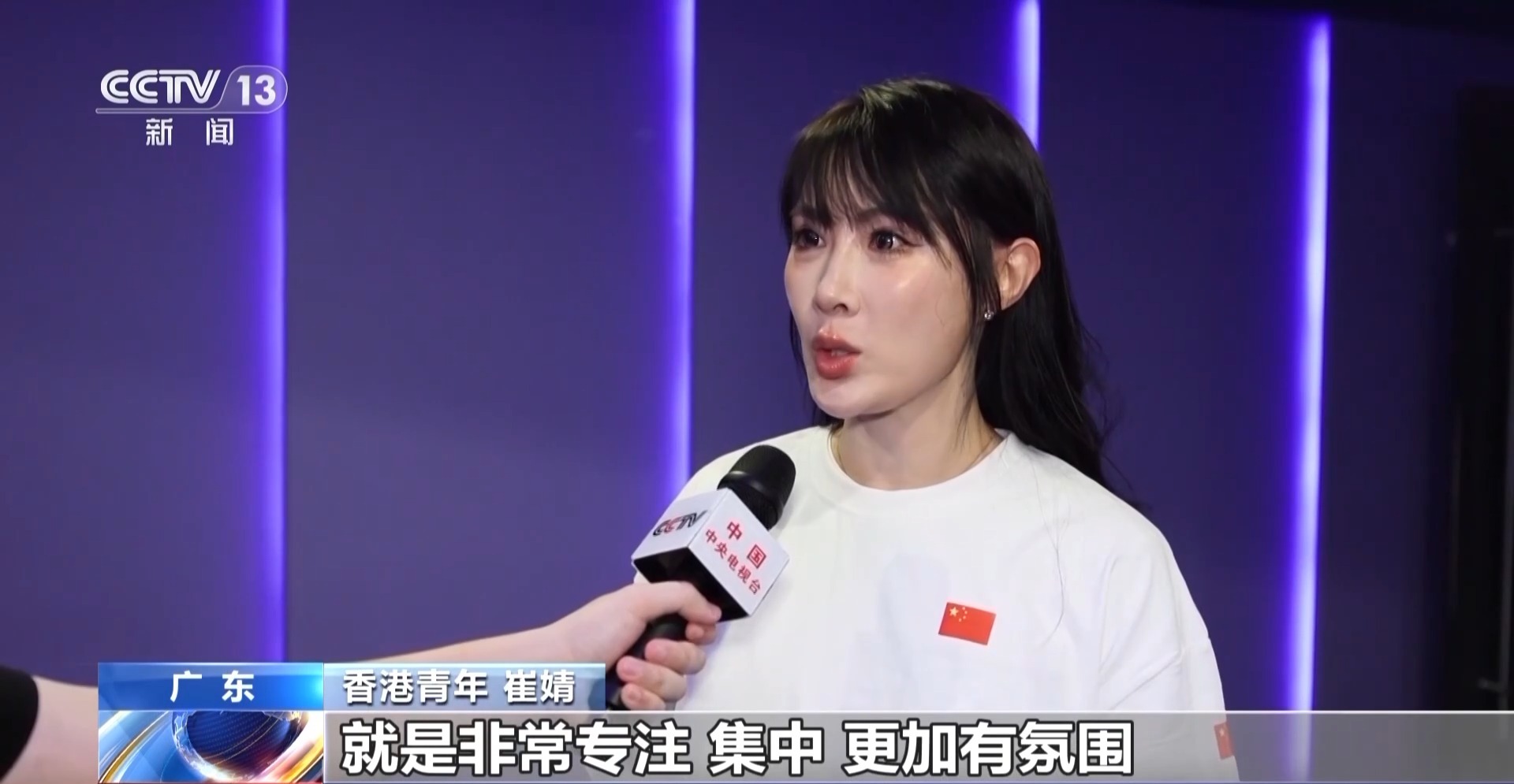 香港青年 崔婧:在電影院看,就是非常專注、集中,更加有氛圍,當(dāng)五星紅旗升起的那一刻,全場(chǎng)齊聲唱國(guó)歌,有熱淚盈眶的感覺(jué),感覺(jué)到國(guó)家的團(tuán)結(jié)和力量。我看到了強(qiáng)大的海陸空軍隊(duì)陣容、先進(jìn)的現(xiàn)代化武器裝備,很震撼。我覺(jué)得國(guó)家的強(qiáng)大就是我們最大的底氣,希望祖國(guó)繁榮富強(qiáng)。