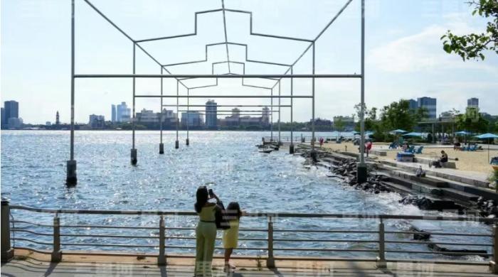 當地時間7月22日,美國紐約曼哈頓甘斯沃特沙灘旁,矗立著永久公共藝術項目“一日之末”。圖/中新社記者 廖攀 攝