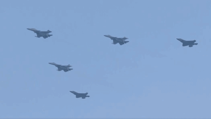 航母佩劍,刀尖舞者,殲-15DH、殲-15DT、殲-35和殲-15T編成兩個楔隊接受檢閱,從滑躍起飛到彈射出擊,從單一機型到多機協同,中國艦載機跨越發展,搏擊海空。