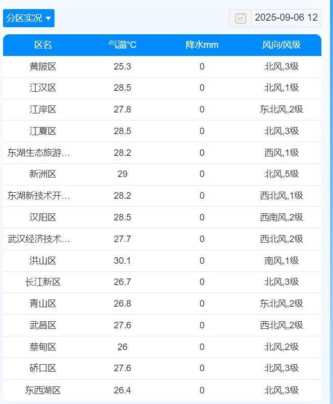 氣象數據顯示:早間最低氣溫黃陂北部、東西湖西部和蔡甸北部最低氣溫在23-24℃,其他地區在24-27℃,而直至中午12時,仍保持著涼爽狀態,武漢大部地區氣溫均未超30℃,多在26-28℃之間。