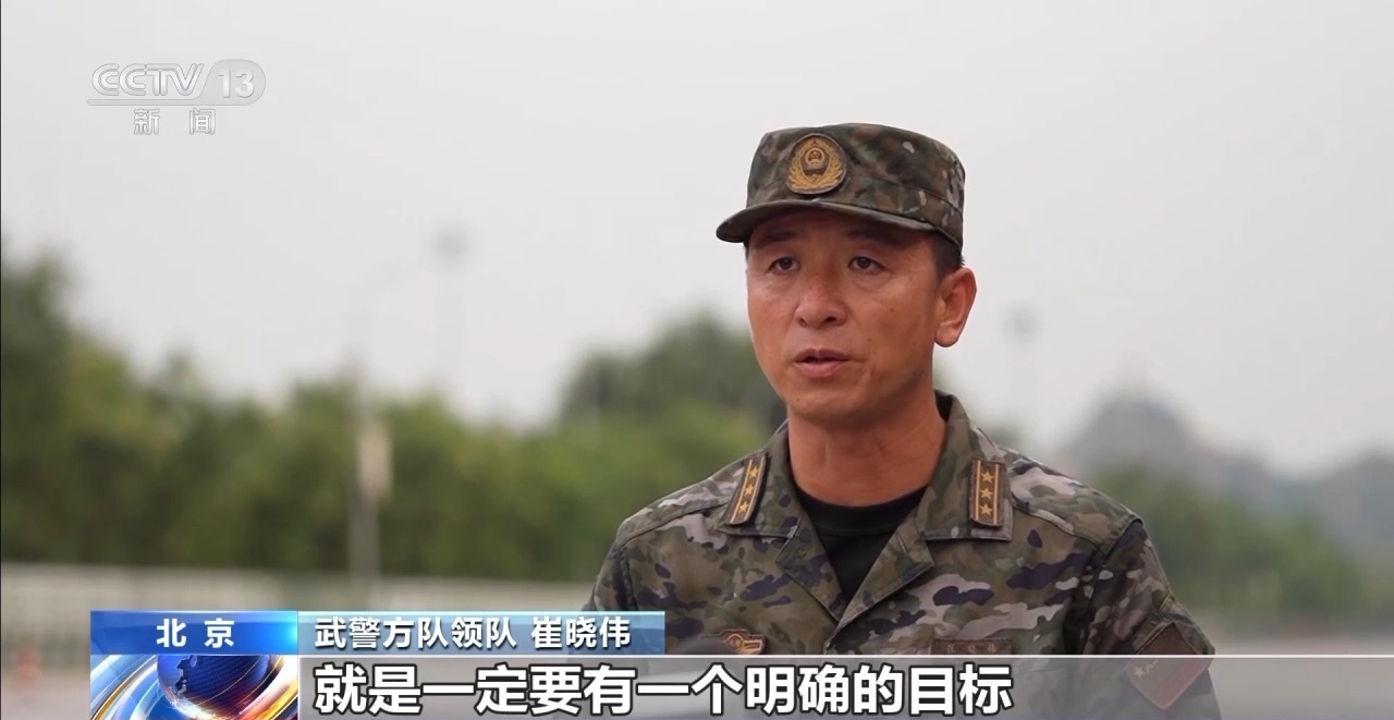 武警方隊領隊 周勇:一個好的受閱方隊有四句話來形容,第一句話是一塊鋼板,一個方隊過來就像一塊鋼板一樣硬。第二句話就是兩個標桿,指的就是兩個領隊,然后叫三條切線,就是斜線、橫線和縱線。最后一句話叫四壁銅墻,形容這個方隊非常的板正,我們倆領隊就是其中的一個,兩個標桿。所以練好方隊的動作,首先領隊也要做好。