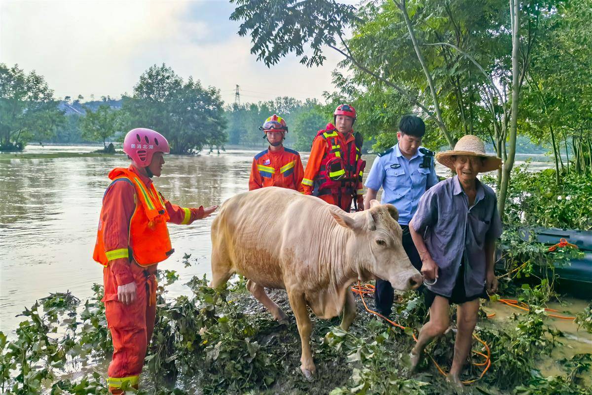 到達事發地段后,民警發現,河道水流湍急,水位仍處于高位。兩頭黃牛被困于距岸邊約60多米,因長時間受困已顯疲憊,隨時都有被洪水沖走的危險。鑒于救援難度較大,民警當即聯系了消防救援部門請求支援。