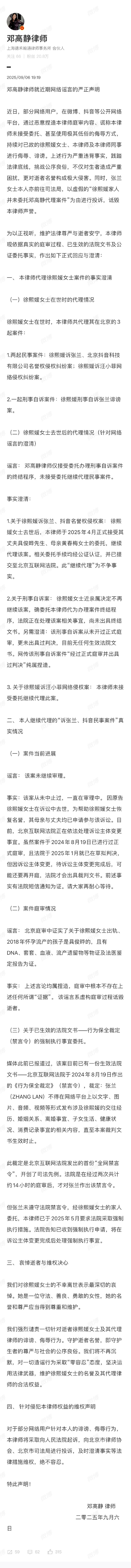 9月6日,大S律師@鄧高靜律師 就近期網(wǎng)絡(luò)謠言發(fā)布嚴(yán)正聲明,并稱:“我們對(duì)徐熙媛女士的不幸離世表示最深切的哀悼。她是一位守法、善良、勇敢的女性,她的名譽(yù)和尊嚴(yán)應(yīng)當(dāng)?shù)玫阶鹬睾途S護(hù)。