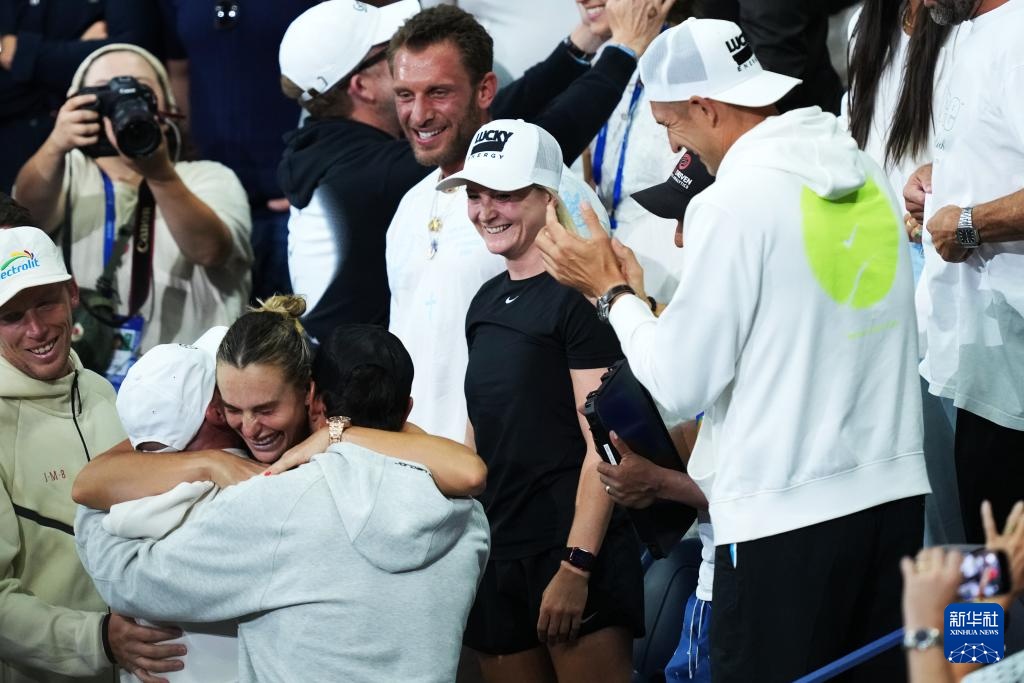9月6日,薩巴倫卡(下左三)在賽后接受親友祝賀。