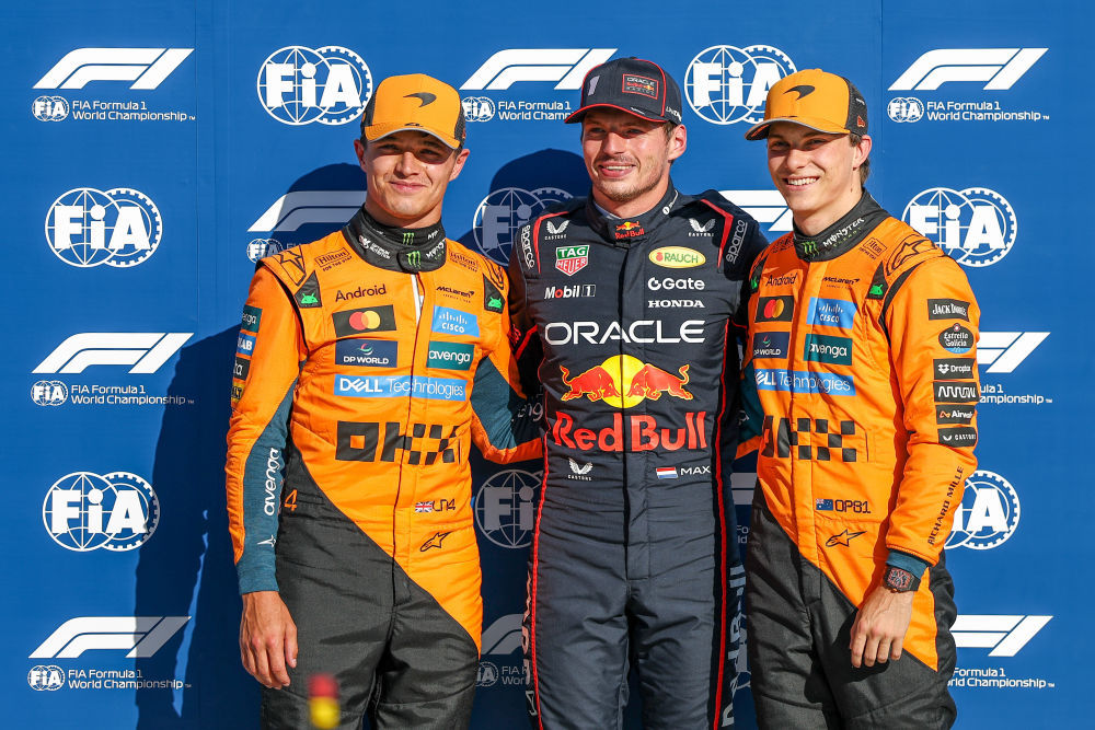 9月6日,獲得桿位的紅牛車隊(duì)荷蘭車手維斯塔潘(中)、第二名邁凱輪車隊(duì)英國(guó)車手諾里斯(左)、第三名邁凱輪車隊(duì)澳大利亞車手皮亞斯特里在賽后合影。當(dāng)日,2025賽季世界一級(jí)方程式賽車錦標(biāo)賽(F1)意大利大獎(jiǎng)賽排位賽在意大利米蘭附近的蒙扎賽道舉行。新華社發(fā)(錢俊攝)