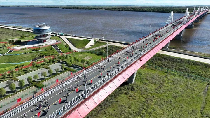 ↑9月6日,運動員正在通過黑河-布拉戈維申斯克公路橋