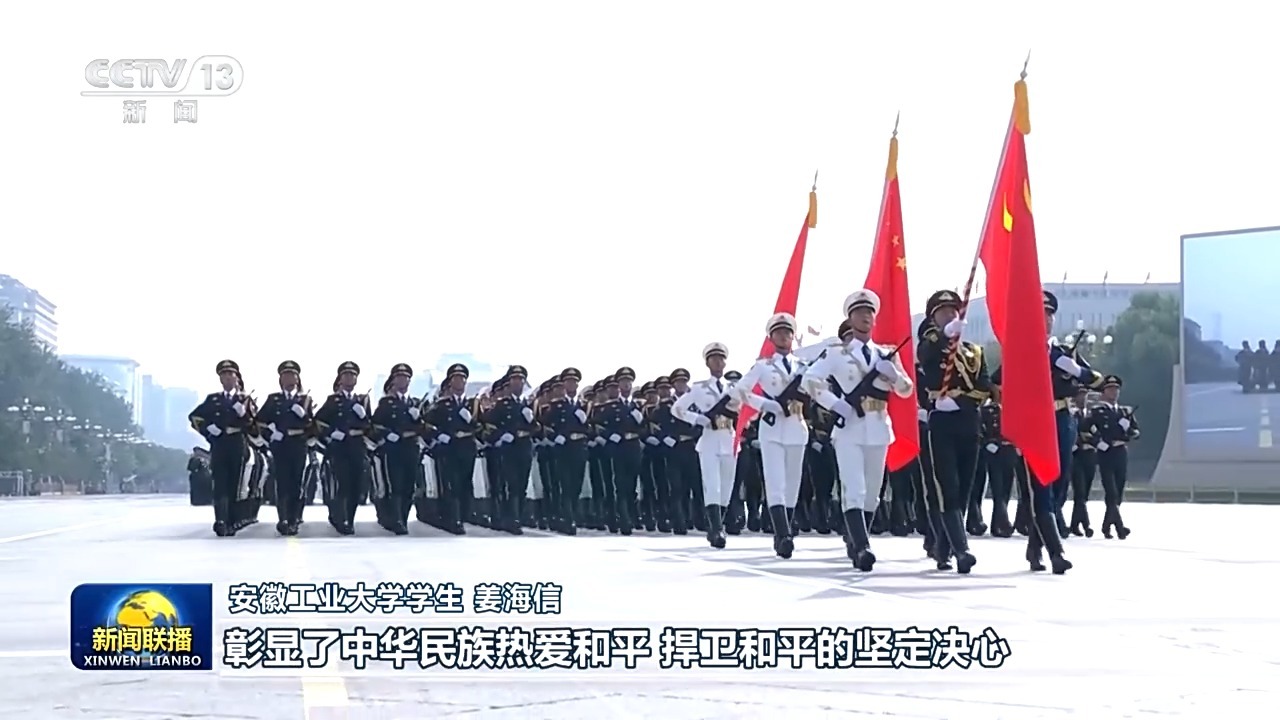 安徽工業大學學生 姜海信:感受到在中國共產黨的堅強領導下人民軍隊的威武雄壯,彰顯了中華民族熱愛和平、捍衛和平的堅定決心,我們一定要深刻理解偉大抗戰精神的時代價值,培養愛國之情、砥礪強國之志、實踐報國之行。